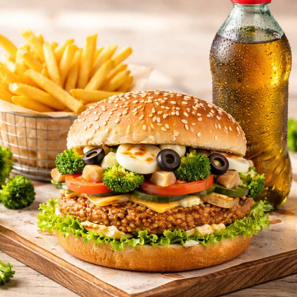 Combo VegetarianoPao, Queijo, Hamburguer De Lentilha, Maionese, Alface, Tomate, Picles, Brocolis, Azeitona Preta, Ovo Cozido, Palmito E Cebola Na Chapa. Acompanha Fritas E Refrigerante.