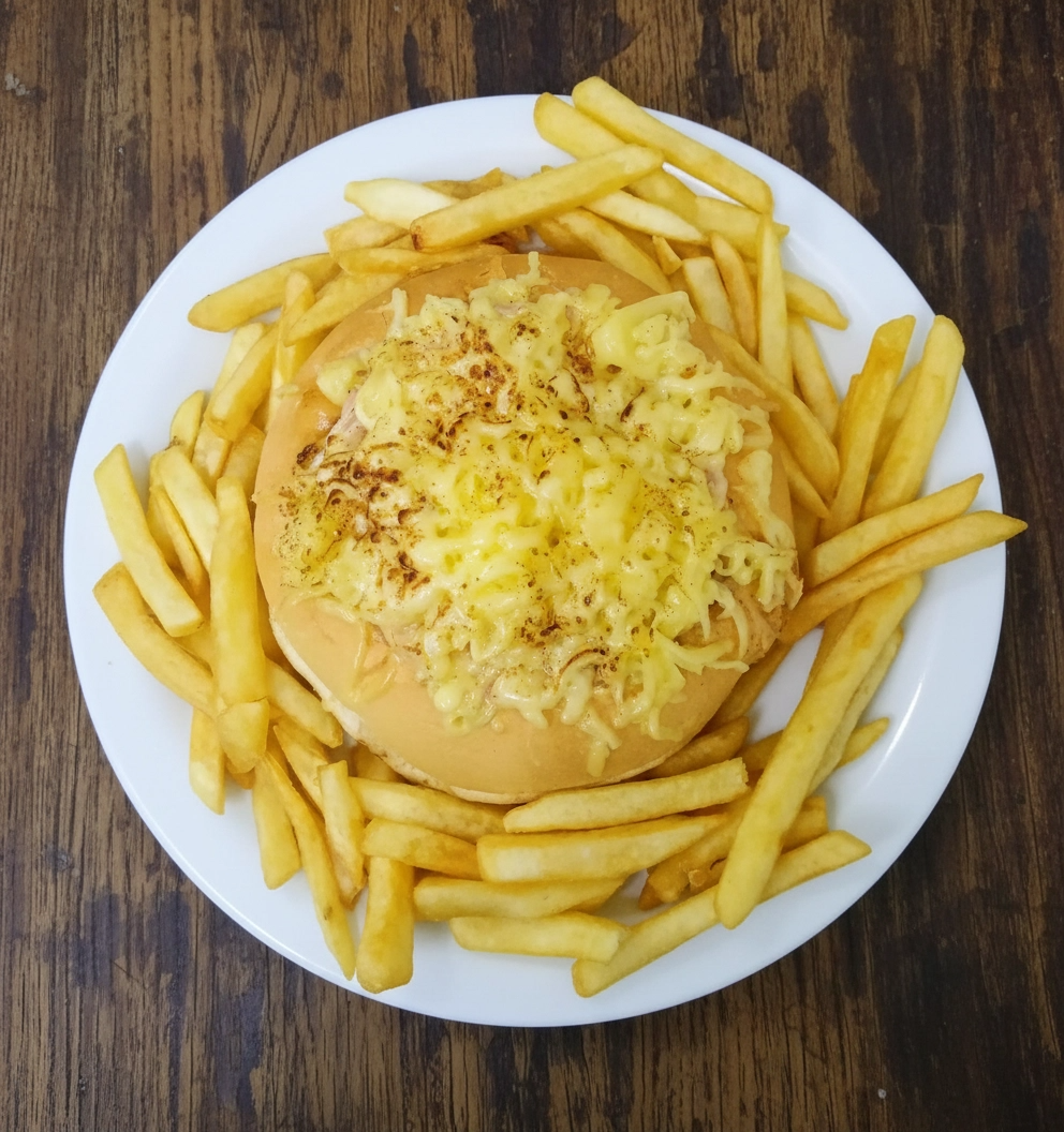 Xis VulcãoPão, maionese, carne, presunto, ovo, coberto com muito queijo e fritas
