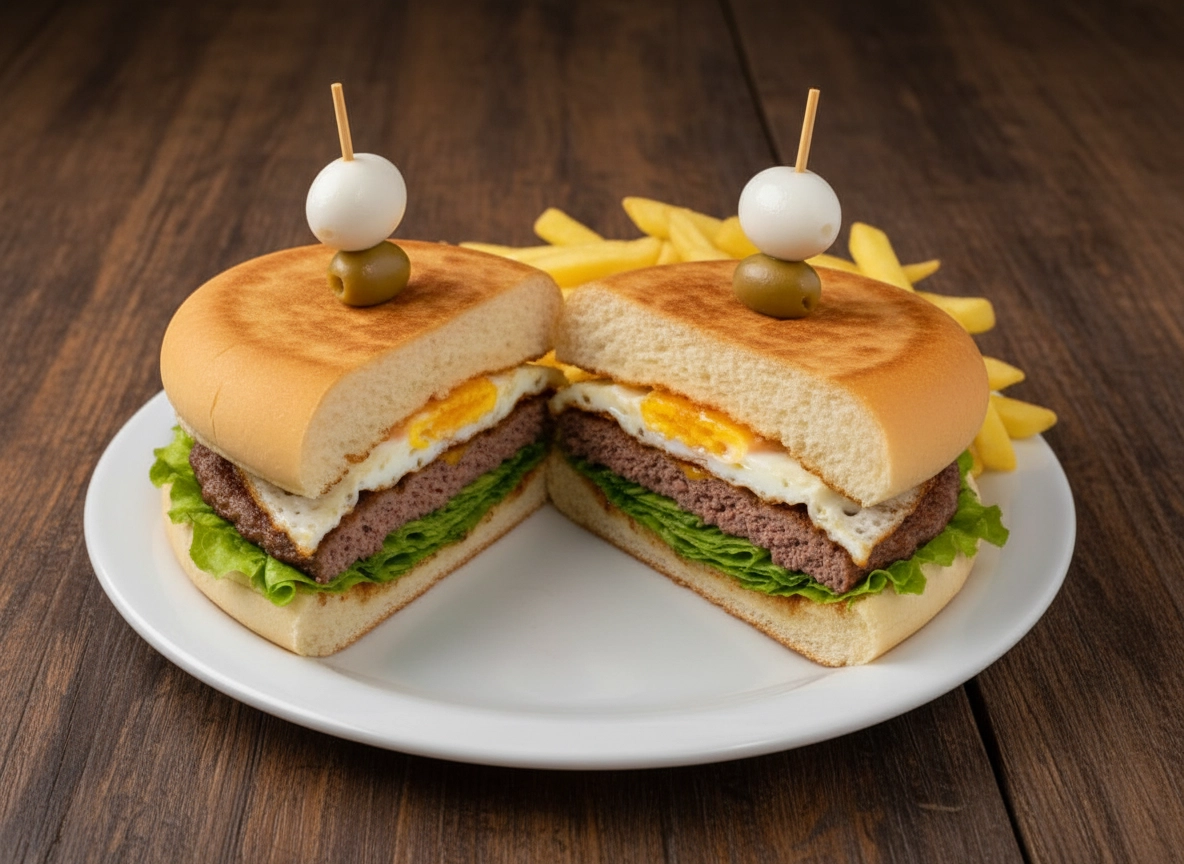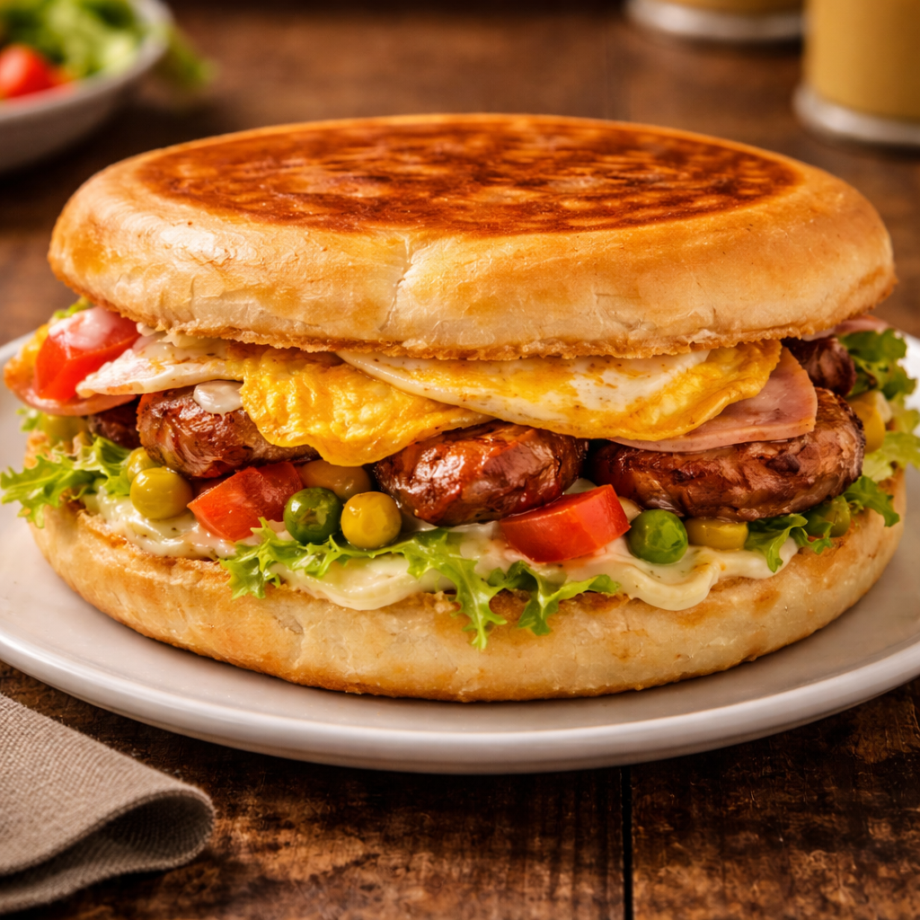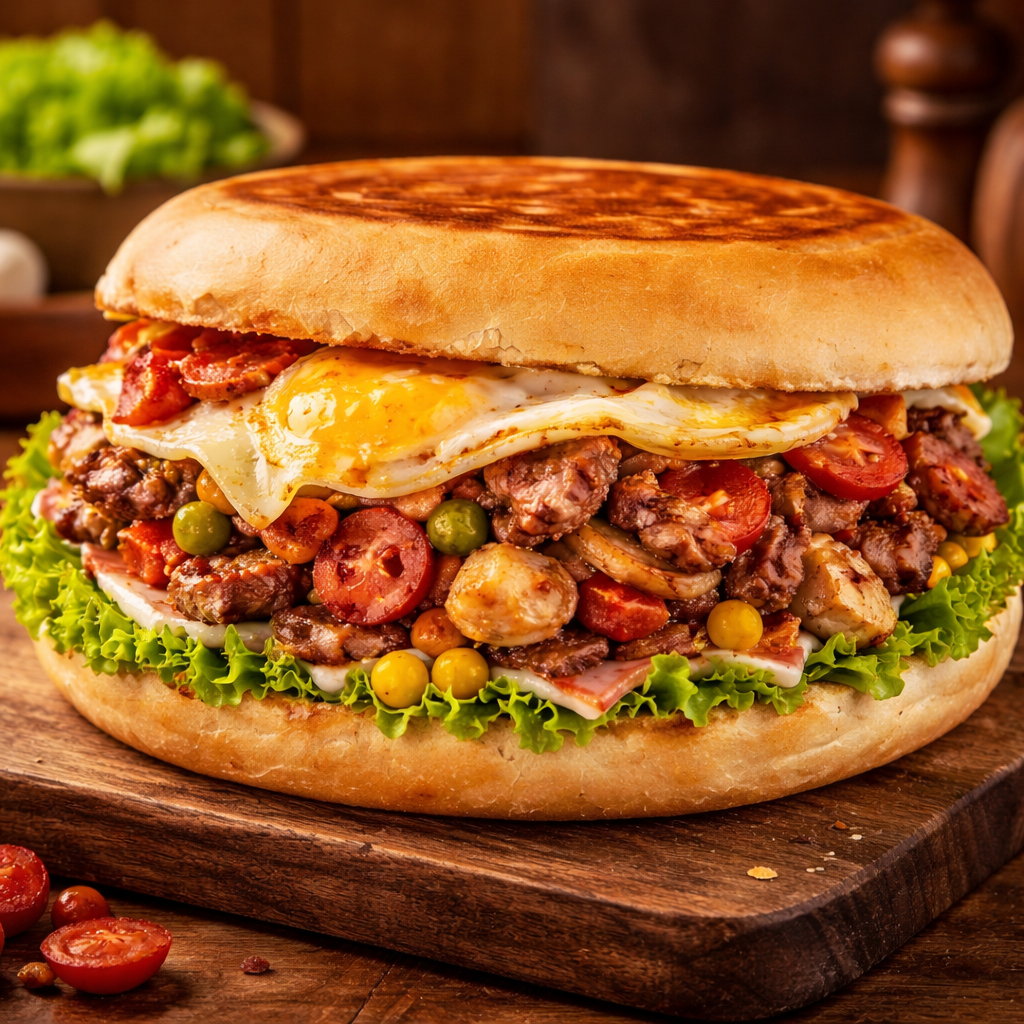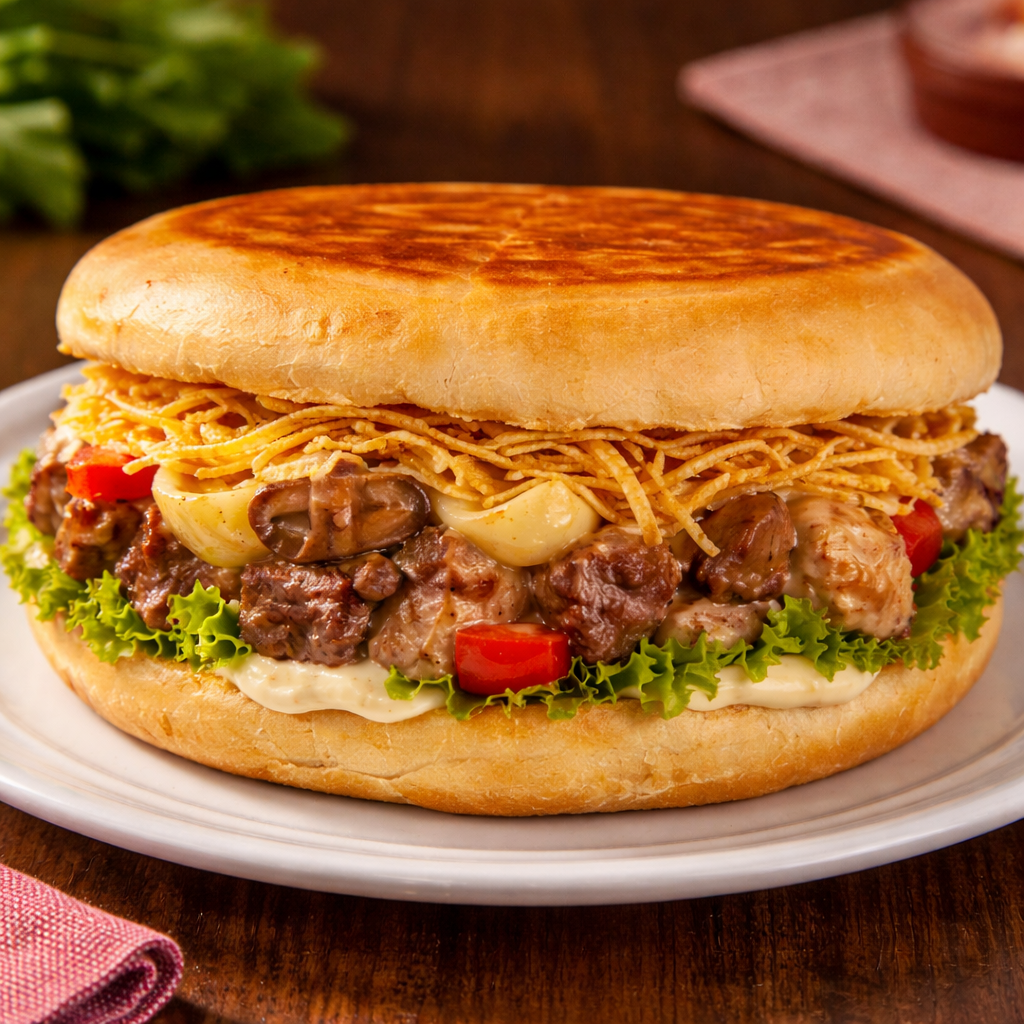 Xis BauruPao Cervejinha, Bife De Alcatra, Maionese, Rucula, Presunto, Queijo, Ovo, Tomate Seco. Acompanha Fritas