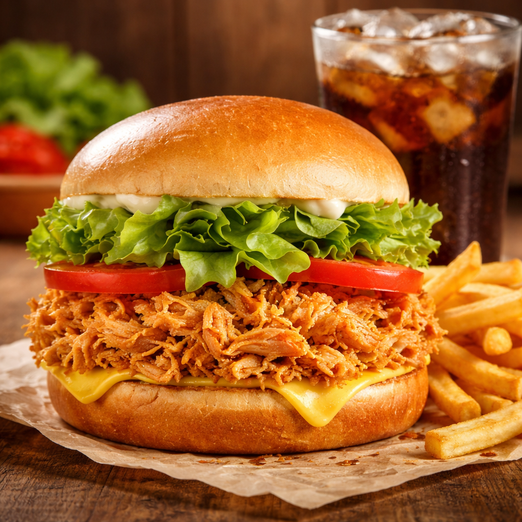Combo Chiken BurguerPao, Queijo, Frango Desfiado Ou Em Cubos, Molho Especial, Maionese, Alface E Tomate. Acompanha Fritas E Refrigerante