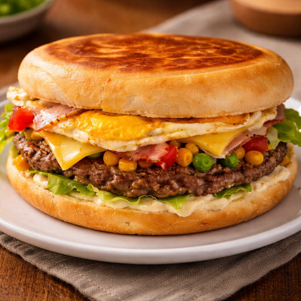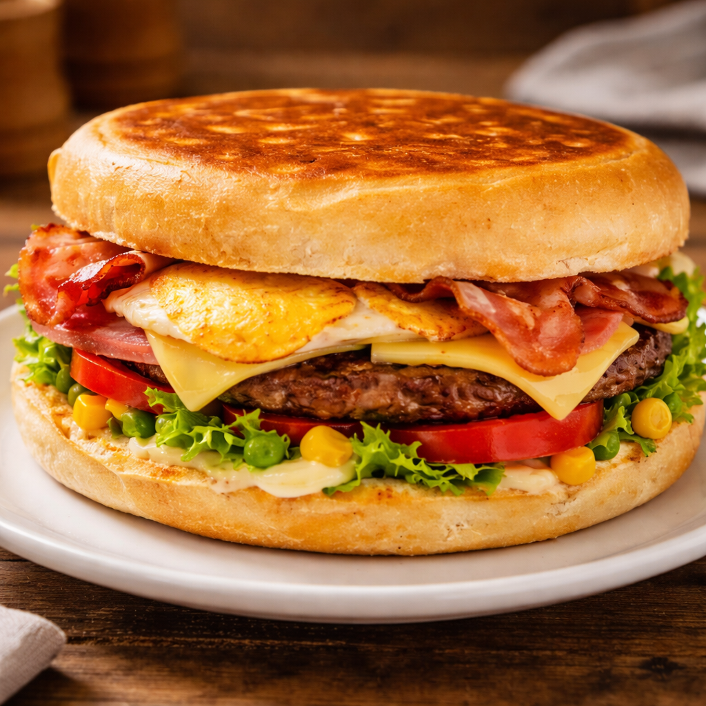 Xis BaconMaionese, Tomate, Alface, Milho, Ervilha, Hamburguer, Bacon, Queijo, Presunto E Ovo