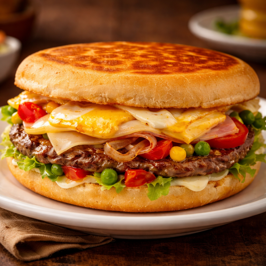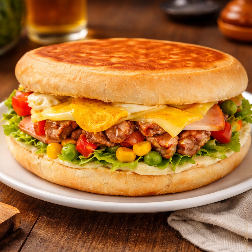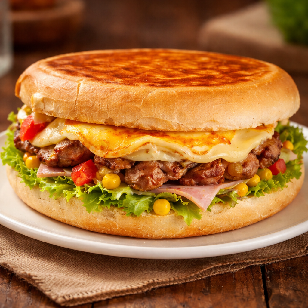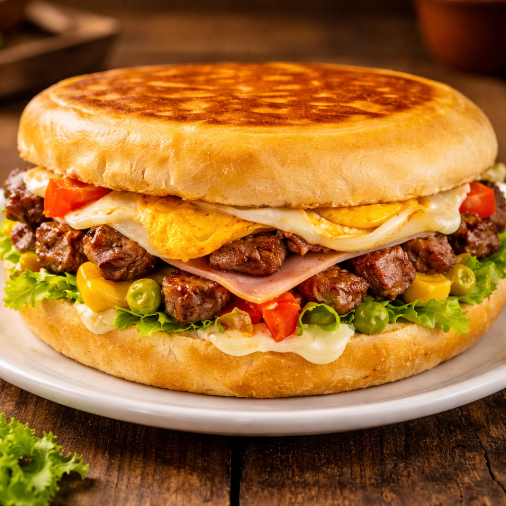 Xis Carne em CubosMaionese, Tomate, Alface, Milho, Ervilha, Cubos De carne, Queijo, Presunto E Ovo.