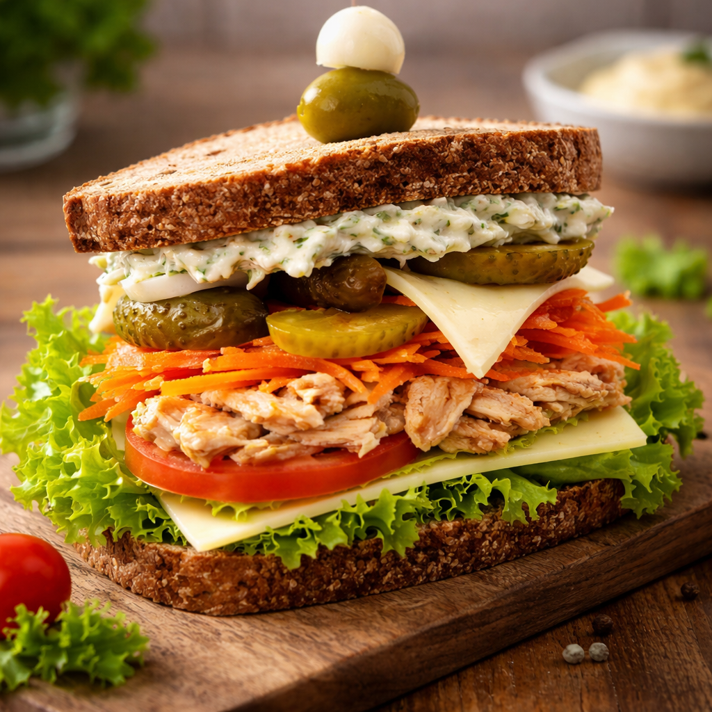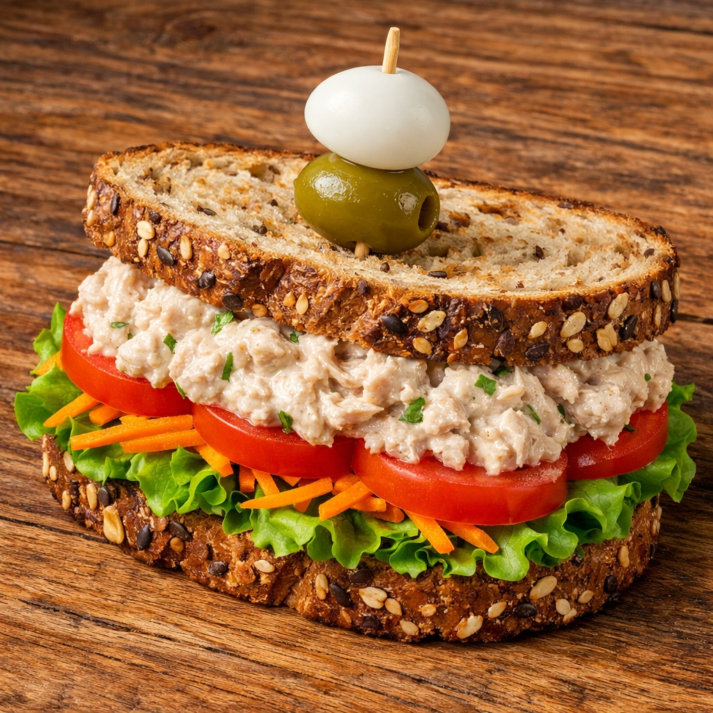 Sanduiche Natural AtumPao Preto, Maionese, Pepino, Cenoura Ralada, Alface, Tomate, Atum, Ovo Cozido E Queijo.