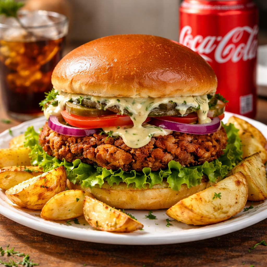 Combo à ParmegianaPão de hambúrguer, maionese, tomate , alface, picles, cebola roxa, bife de hambúrguer à milaneza, queijo, acompanha refri Coca Cola lata e batatas rústicas.