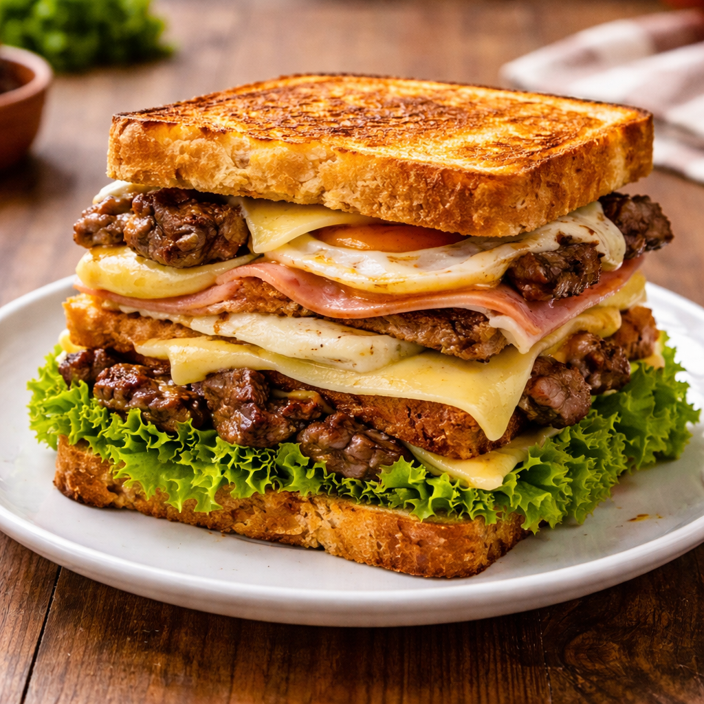 Torrada FilePao De Forma, Maionese, Alface, Queijo, Ovo, Presunto E Cubos De File.