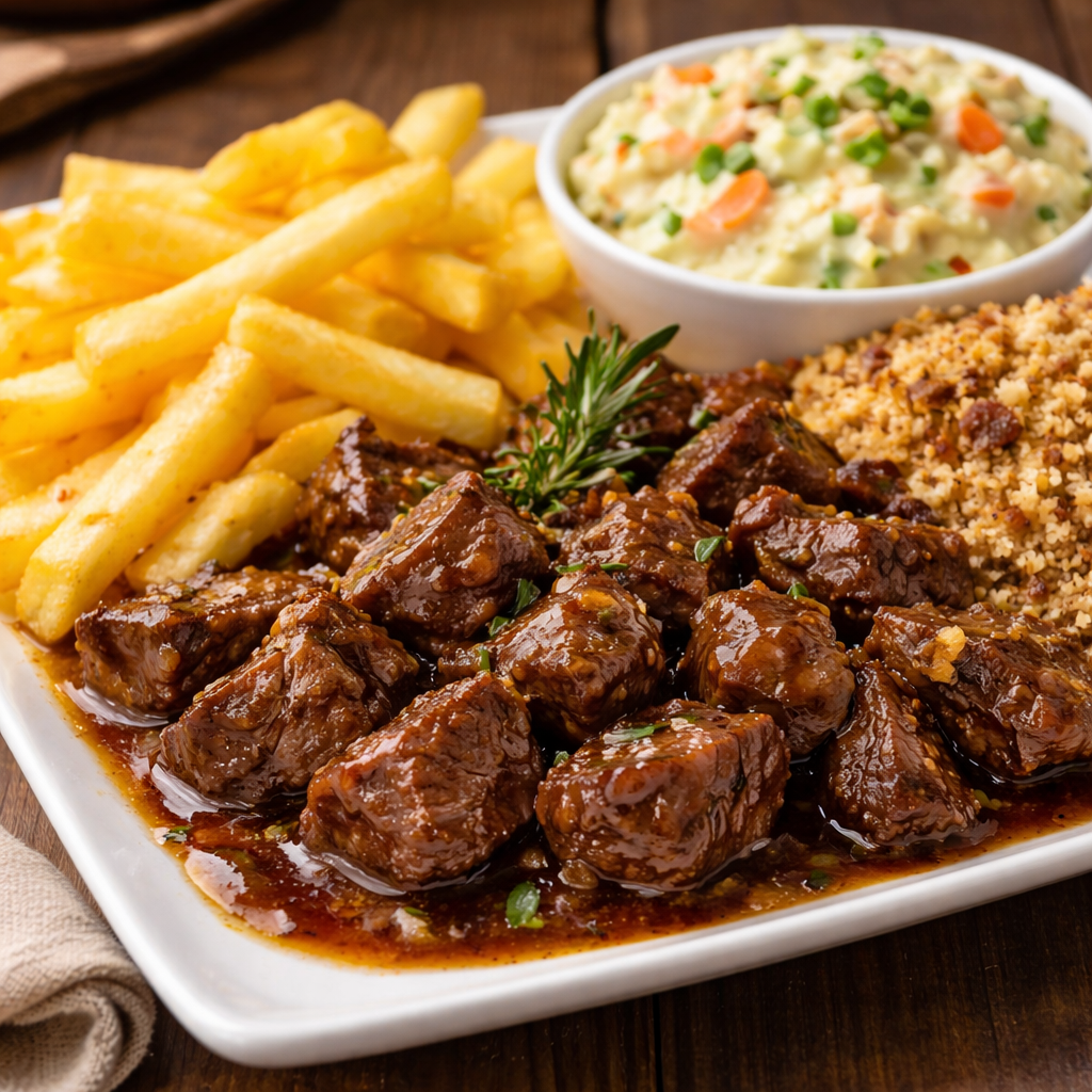 Xis StrogonoffFile Mignon Em Cubos, Molho De Strogonoff, Batata Palha, Champignon E Maionese.