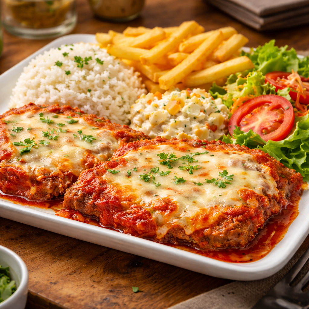 Filé à parmegianaBife de filé (2) regados ao molho de tomate, queijo, acompanha arroz, salada de batatas, tomate, alface e fritas. Serve duas pessoas.