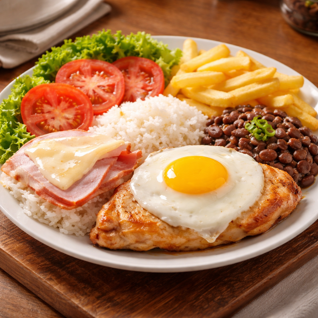 A La Minuta FrangoArroz, 1 Bife De Frango, Tomate, Alface, queijo ,presunto, Ovo,feijao E Fritas.