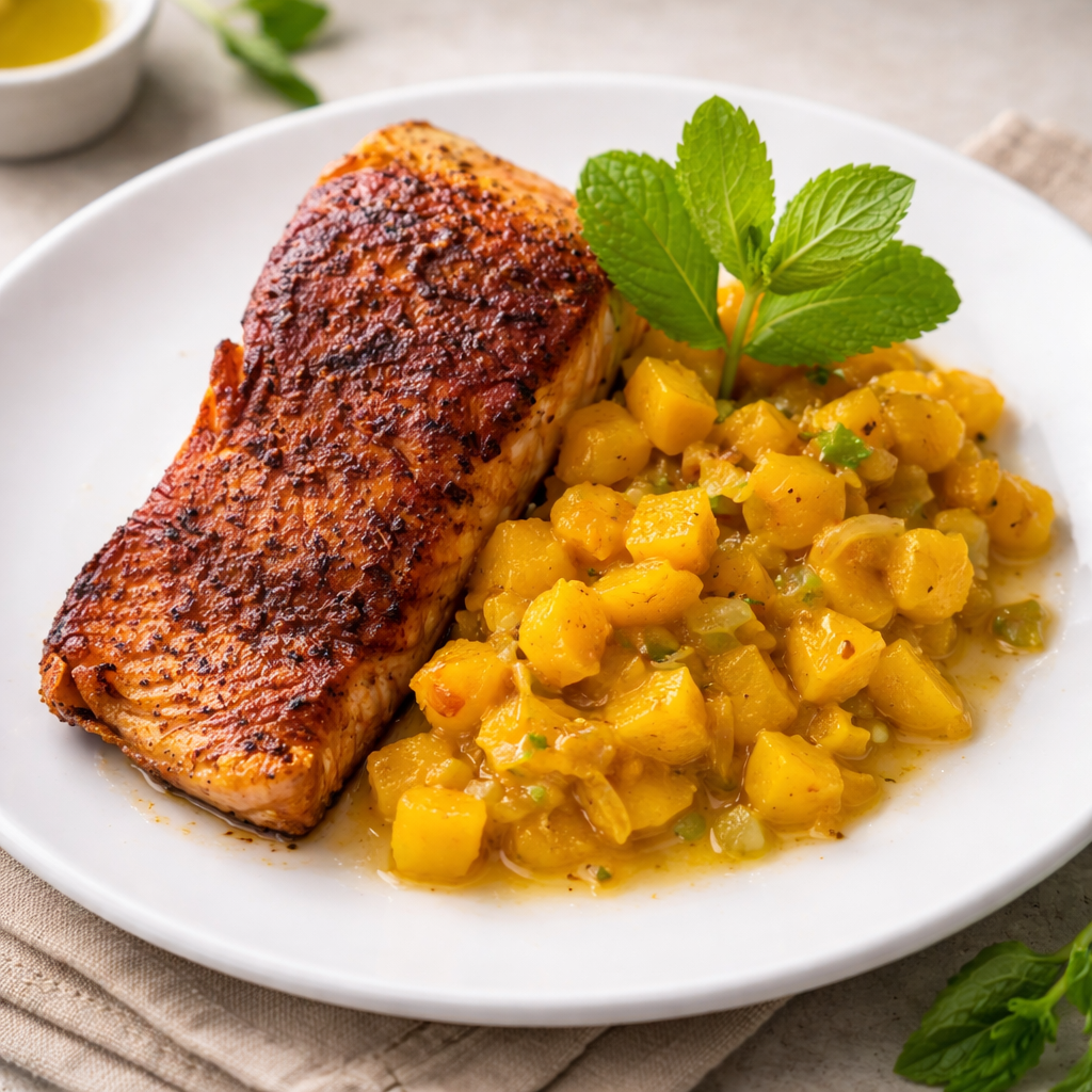 Salmão TropicalSalmão do Atlântico gratinado com cebola refogada, manga e hortelã. Serve uma pessoa. tempo de preparo: 30 a 40 minutos
