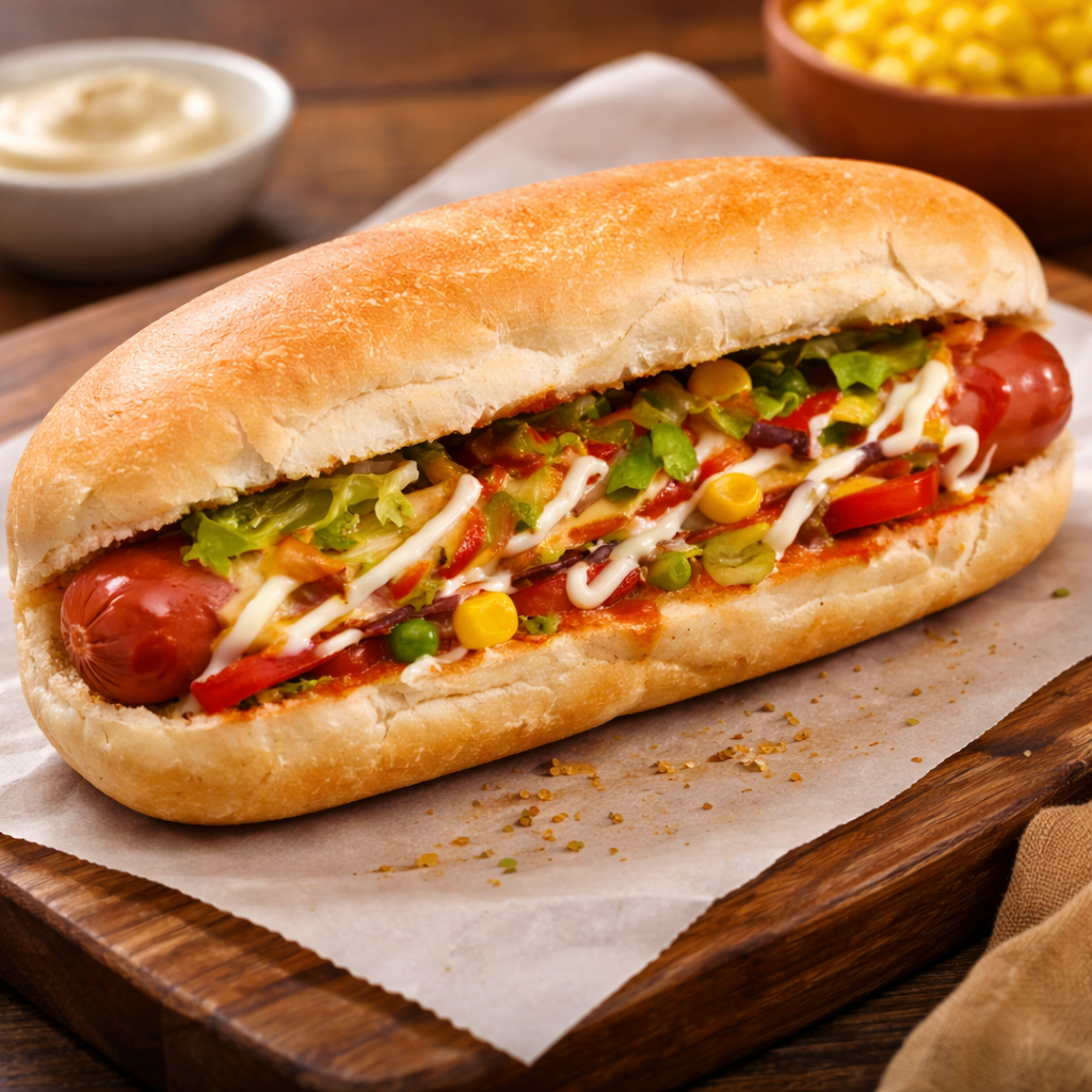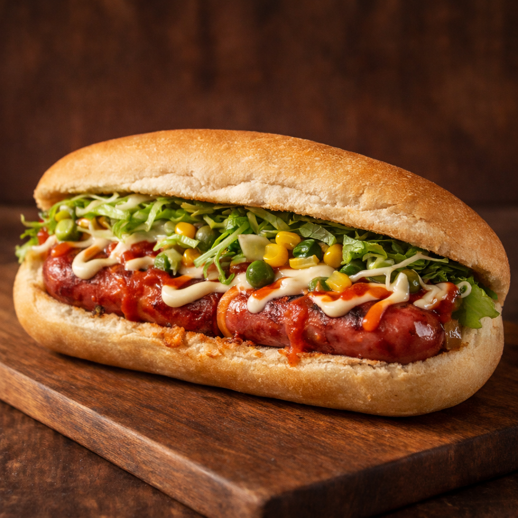 Dog Salsicha PrensadoMaionese, Molho Da Casa, Alface, Milho, Ervilha E 2 Salsichas.
