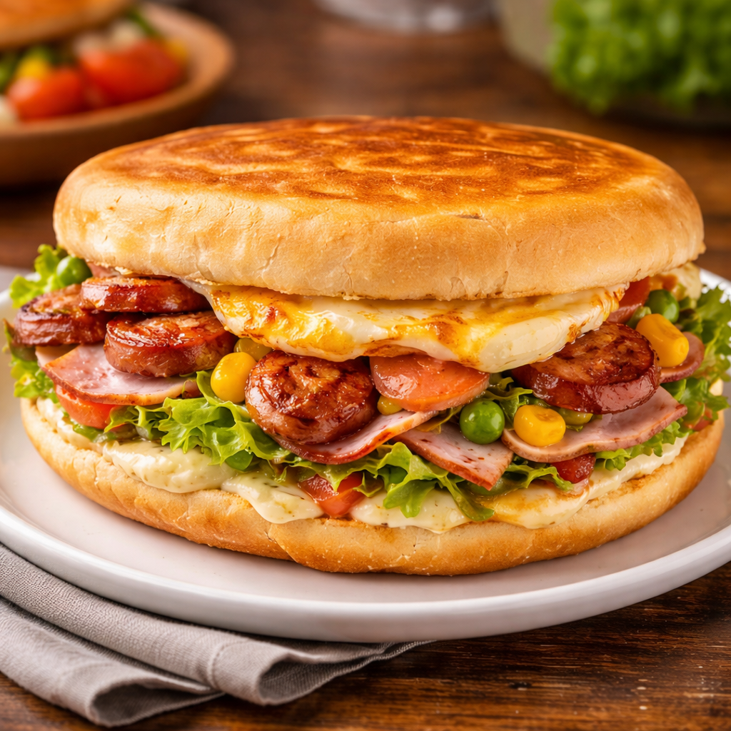 Xis Linguica CampeiraMaionese, Tomate, Alface, Milho, Ervilha, Linguica Campeira, Queijo, Presunto E Ovo