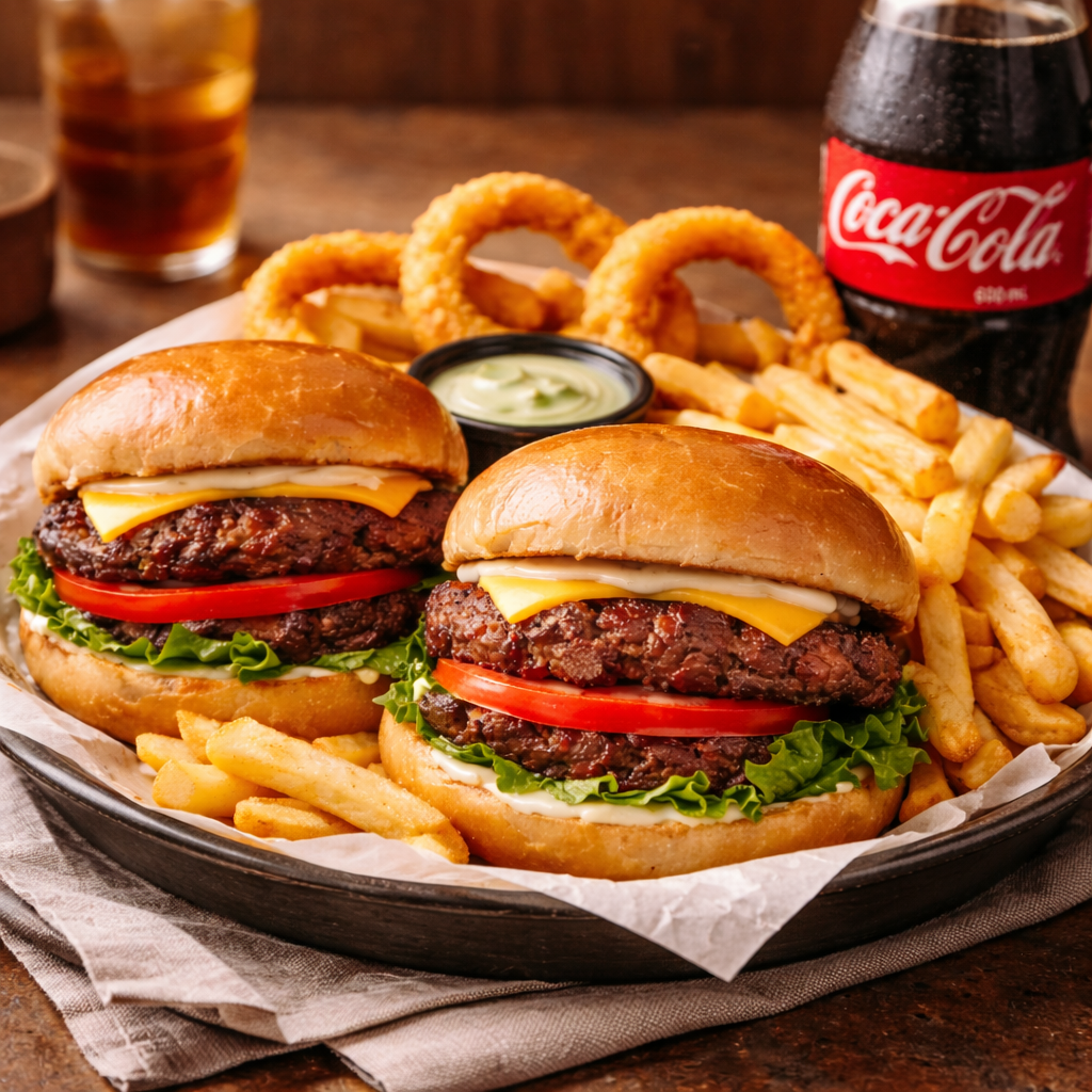 Combo CrushDois hamburgueres com maionese, bife, tomate, alface, queijo cheedar, fritas, anéis de cebola. Acompanha refrigerante coca cola 600ml