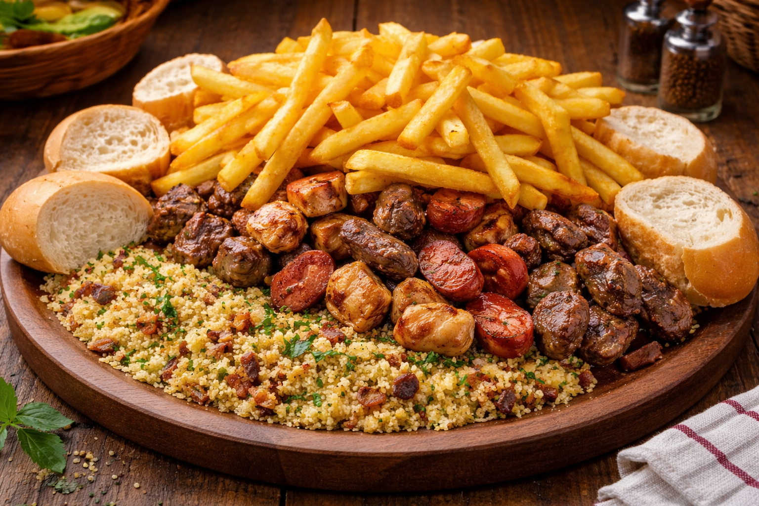 Meio Super Petiscão do PlanetaCarne de gado, Lombo de porco, Coração de galinha, Calabresa, Filé de Frango, Cebola, Fritas, Farofa temperada e Pãozinho.