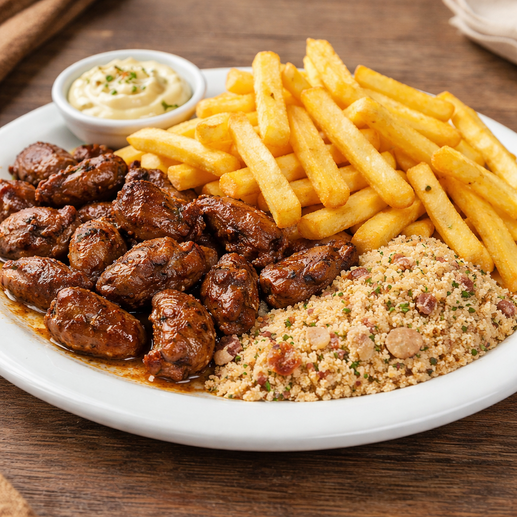 1/4 de Petiscão do PlanetaCarne de gado, lombo de porco, coração de galinha, calabresa, filé de frango, cebola, fritas, farofa temperada e pãozinho .Serve duas pessoas.