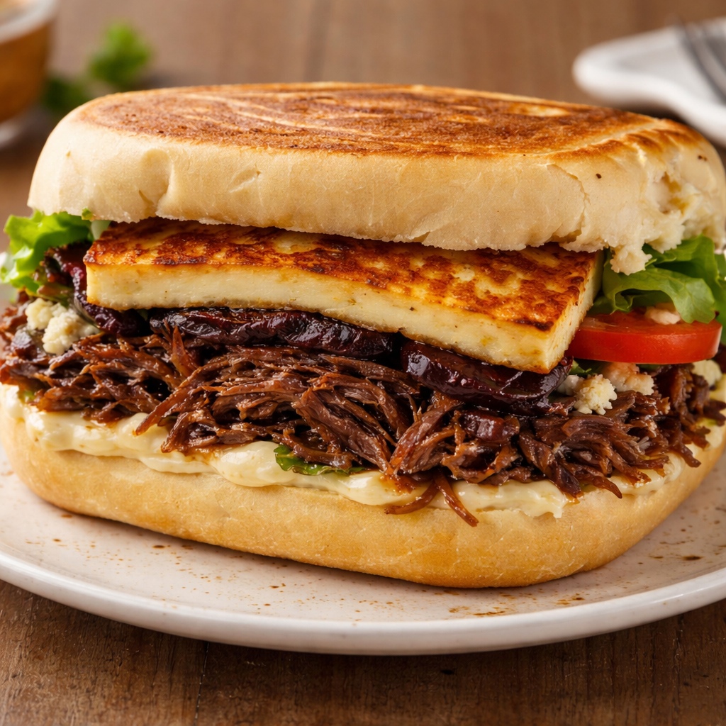Xis BahPão de xis, maionese, carne de vazio desfiada, queijo coalho, cebola roxa , queijo gorgonzola, alface e tomate